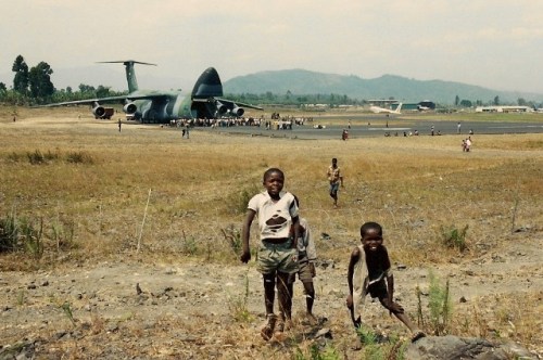 There’s a surreal quality to the Goma airstrip. As the C-5A Galaxy from Travis Air Force Base came in low for the landing, young children scurried out of the jet’s path, many knocked over by the wash. It’s a little game they play in Goma.