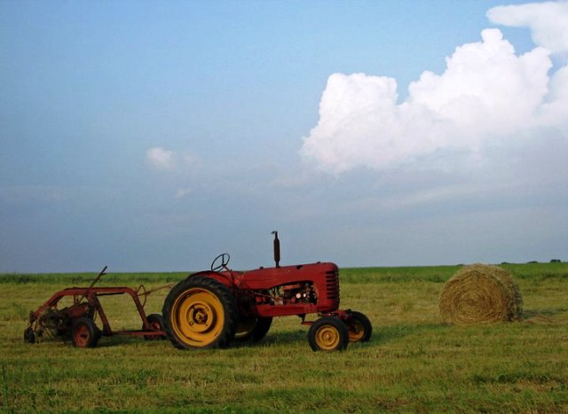 A tractor and hay roll sit in a field in Aroostook County, Maine. Photo by Kelly McInnis