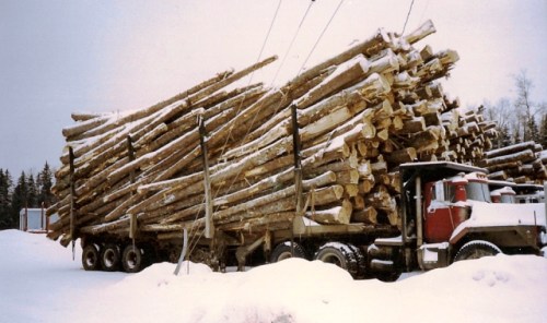 While this photo was taken during the winter, this is an example of how high logs are piled on trailers to be transported to mills. The photo was taken by Diana Michaud.